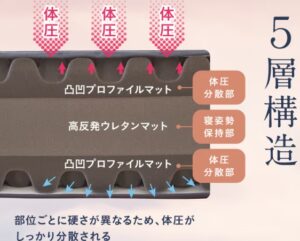 雲のやすらぎプレミアムマットレスモデル3Rは、5つの異なる層でできています。これらの層が一緒になって、あなたの体を完璧に支え、一晩中快適に保ちます。例えば、高反発ウレタンマットの硬い層と体圧分散層が組み合わさって、腰や首など、必要な部分にちょうど良いサポートを提供してくれるんです。